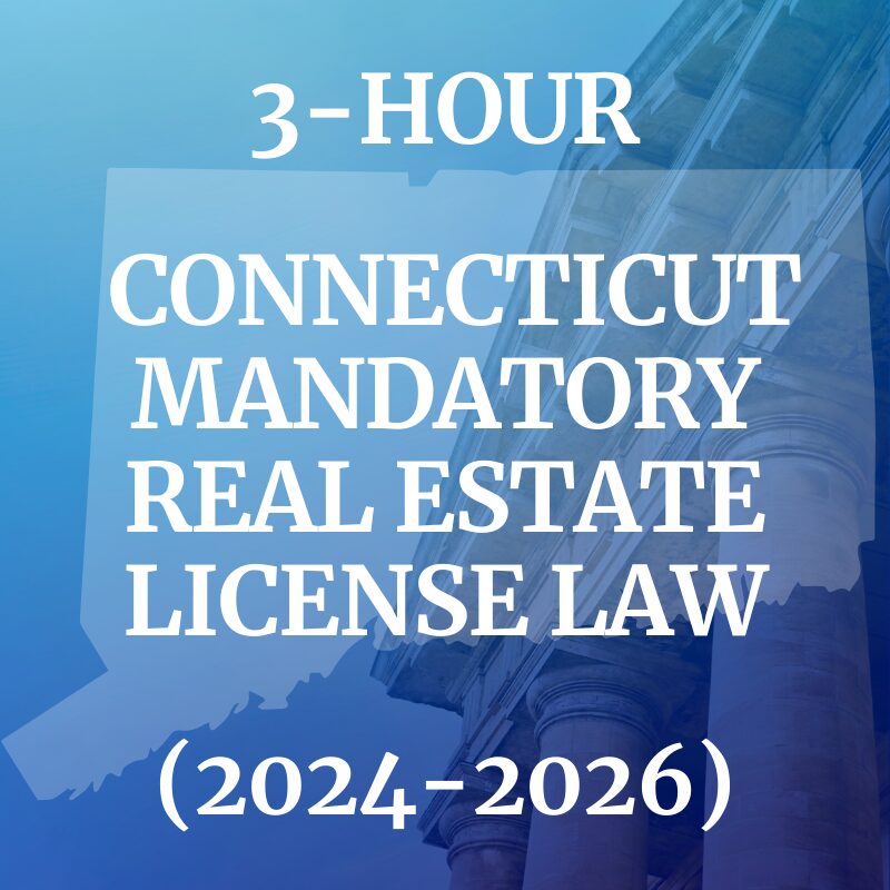 This 3 hour course for CT real estate licensees consists of current real estate and fair housing legislation, licensing laws and regulations pursuant to CT Real Estate Regualtions Sec. 20-319-3(b)
