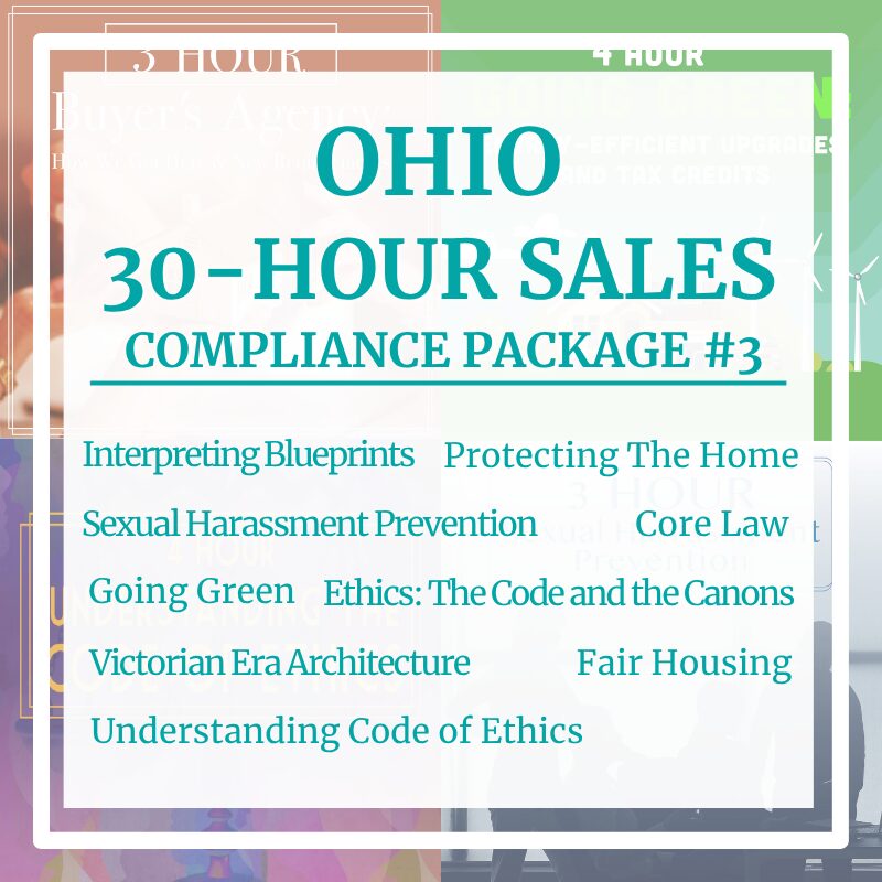 This 30-hour online CE package fulfills the full requirements for the First or subsequent renewal of an Ohio Salesperson license that is not currently at a management level.